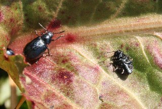 【左】コガタルリハムシがギシギシの葉を食べていました。