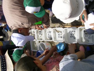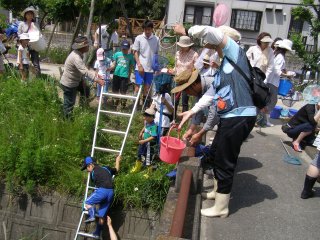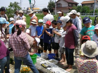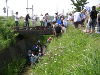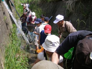 天気はまずまず、参加者の皆さんも元気いっぱいで梅の館に集合しました。梅の館で参加者に観察の仕方について諸注意をしてから現地に徒歩で移動しました。信濃川に堆積していた土砂を取り除いたため川面が下がったためはしごを使って降りました。子供たちにはスリルがあり、いい体験になったと思います。土砂を取り除いたため少なくなった魚はメダカ、オイカワ、マドジョウ、などで、ナマズは見られなくなってしまいました。それでも信濃川は上流に汚水を出すところがないためいろいろな種類の魚や水生昆虫がみられました。天気がよく参加者の皆さんは楽しく観察をすることができました。(記・金内)