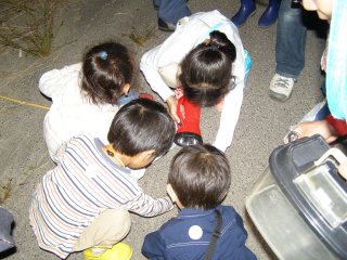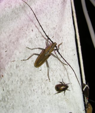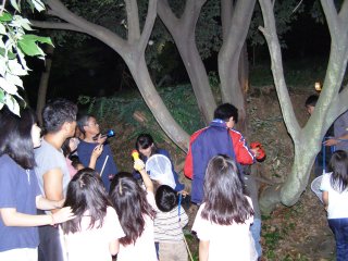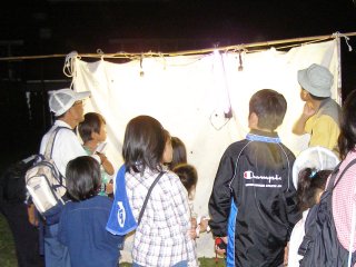灯火観察の水銀灯にたくさんのガと甲虫が集まります。子供たちは甲虫が好きでカナブンのの仲間をたくさん集めます。手で触った感触がなんとも言えないのでしょうか。自然観察で触るということは体験として長い間記憶に残るようです。