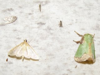 【左】水銀灯を灯し夜明かりにくる虫を集めました。 【右】アワノメイガ(左)、アオイラガ(右)