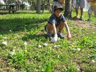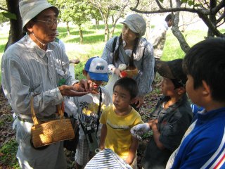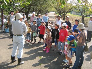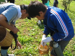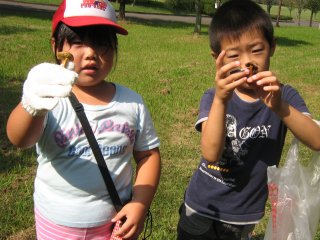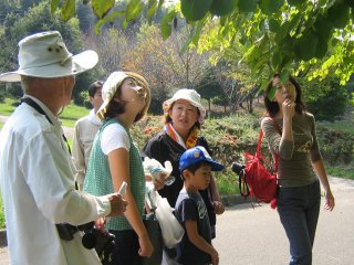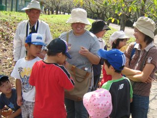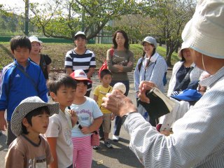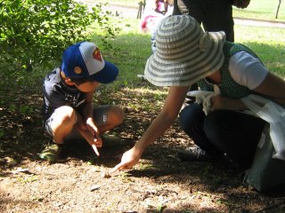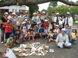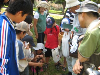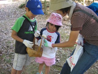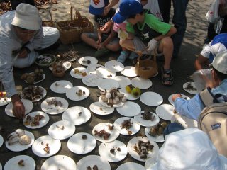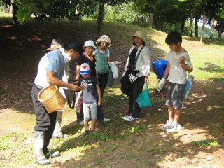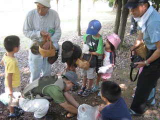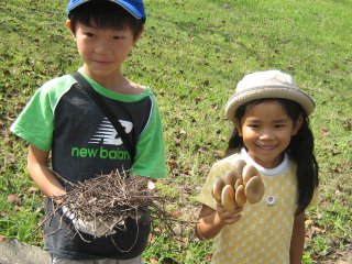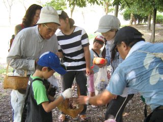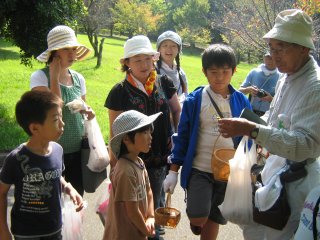 心地よい秋晴れ。降幡さんのキノコについての説明を受けて、キノコを見つけにいきました。小さな池のほとりの草地でオオシロカラカサタケの群生を観察し、竹林にむかいました。途中カメやカエルを見つけ、ツマクロヒョウモンの幼虫、地上に落ちた鳥の巣、カブトムシ、イナゴの羽化まで観察できました。採集したキノコを展示。匂いをかいだり、ちょっと味わったり。和やかな観察ができました。(記・高橋)