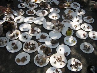 【左】採集したキノコを仕分けしてさらに載せました。 【右】参加者で記念写真