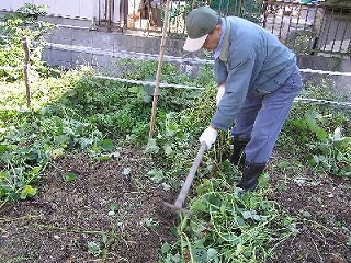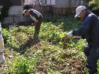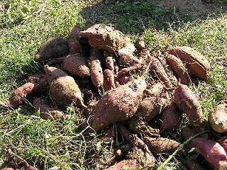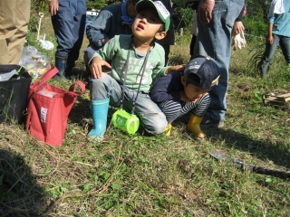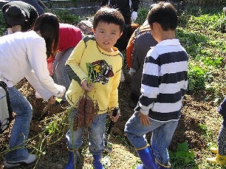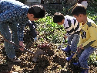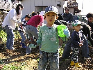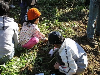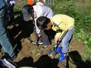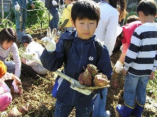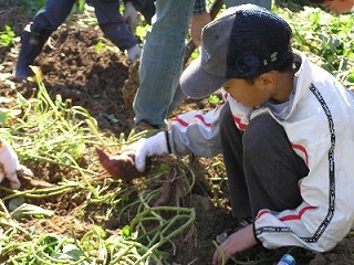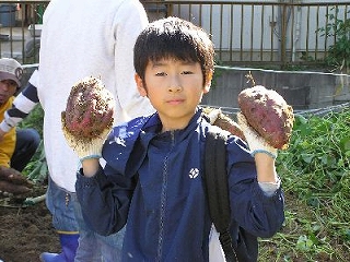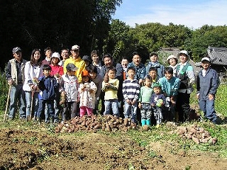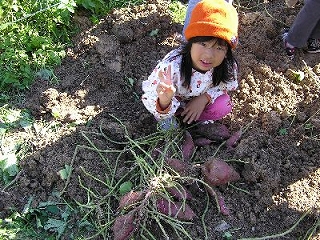 今日は本年初夏の5/20に皆で植えたベニアズマとナルトキントキの収穫日です。「畝の右、左片側づつゆっくり鋤で感触を探りながら掘っていきましょう」と説明を受けた後、行動開始。直ぐに子供さん方から『わア〜お芋が立ち泳ぎしているみた〜い』、『お父さん これ大きいよ〜一緒に引っ張って〜』など土に接しながらの歓声が上がっていました。お父さん方にはサツマイモは痩せた土壌でも成育するのは、つるを長く伸ばし多くの葉で光合成を行って養分を根に与えること、同時に植えた大豆は特有の球根バクテリアを造り空気中の窒素固定を行っている好例です などの話題に興じる中、早くも200本超の収穫。記念撮影後,参加者で仲良く分け合いキチョウの飛翔に送られながら解散しました(小川/記)。