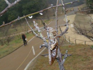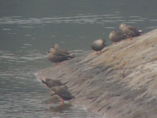昨夜来、前線が太平洋岸を東進、朝まで小雨が残り集合時には止みましたが一般参加者へは昨夕、観察会中止連絡が出されています。小寒、鏡開きも過ぎ本年初の会員のみの観察会です。岩崎さんからコースの説明の後、出発して間もなく散策路を辿るとサザンカの花蜜を啄ばむヒヨドリ、メジロに迎えられ、はたまたモズのトカゲやバッタのハヤニエにお目に掛り自然界の活き様に皆、暫し歩を止めました。視界がやや開けた電線上では雨で濡れた羽根を繕いながら群れをなしてキリリコロロの地鳴きに耳を傾けました。池にはアヒル、アイガモ、マガモなどで賑やかでした。今回、水辺の宝石,カワセミやオシドリが観察できず心残りながら池をあとにしました(小川/記)。