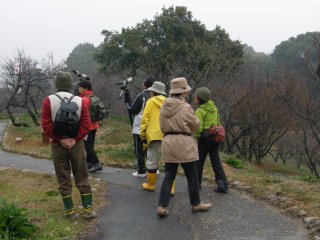 【左】梅園の中を鳥を求めて進む 【右】ヒヨドリ
