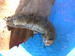 【左】ナメクジが木の葉の下で眠っていました。  【右】カミキリの幼虫が朽木でお尻を出していました。