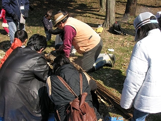 天気予報どおり春本番を思わせる陽気の中、大勢の参加者がセンター内に集合,観察路,注意等を聞き地蔵寺へ移動です。観察開始間もなく階段を降りた池の囲いに水辺の宝石・カワセミのお迎えを受け暫しウオッチング,大草公園に着き虫探しです。女王バチだけが越冬するコガタスズメバチを見付けました。普通,サクラやエノキの朽木に息むタマムシの幼虫が珍しくブナ科の木で発見。コクワ,キマワリの幼虫は沢山見つけましたが残念ながら子供さん達期待のカブトは一匹も見付かりません。棲み処に適した朽木,土壌が見当らなかった様です。ブルーシート上に探した虫さん達に登場願い,皆で分ち合いや幼虫が上手く羽化する飼育法の説明を受け青空一杯の天空を仰ぎながら解散しました(記・沖田)