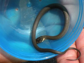 【左】やさしいヘビのヒバカリです。名前は噛まれると命が一日と持たないとこらからです。