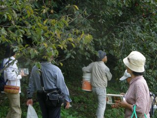 さわやかな秋晴れ、一般の参加者なし会員だけでの散策でした。梅林の北側斜面で、ヒラタケの群生を見つけました。柿の実り、ヤマノイモのむかご、キクラゲ等