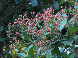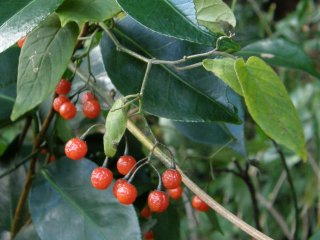 ナンキンハゼ、ホシダ、ヤブソテツ、オニヤブソテツ、イノモトソウ、モッコク、テイカカズラ、マンリョウ、センリョウ、ミミズバイ、ハリガネワラビ、ベニシダ、シャシャンボ、サカキ、カナメモチ、スダジイ、ムクノキ、ハクサンボク、アズキナシ、クロガネモチ、カクレミノ、ヤマモモ、モチノキ、サンキライ、コシダ、イヌホウズキ、ノブドウ、ヒヨドリジョウゴ、カマツカ、ツワブキ、ビナンカズラ、テイカカズラ、カラスウリ、ヘクソカズラ、トウネズミモチ、イロハモミジ、ハウチワカエデ、コハウチワカエデ、オオモミジ、シイ ノハカタカラクサ、ホソバタブノキ、イヌビワ、ホソバイヌビワ、ゴンズイ