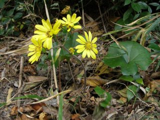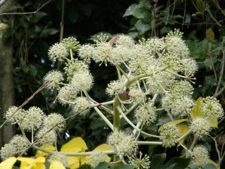 【左】ヤツデの花、越冬昆虫が蜜を吸いに来ます。