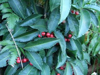 【左】日長神社のモミジの紅葉 【右】縁起植物のマンリョウ