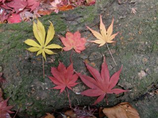 【左】モミジ谷のもみじ。左上からマイクジャク?、コハウチワカエデ、タカオモミジ。下の段左からヒナウチワカエデ、オオモミジ。