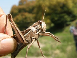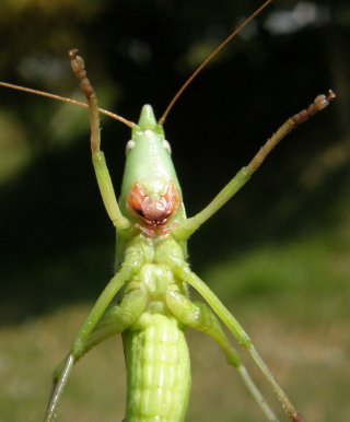 【右】越冬したクビキリギス。桜の葉が開くころ鳴きます。