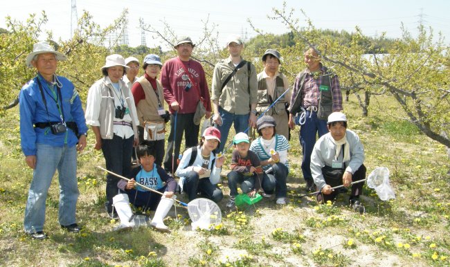 快晴、無風の上、この季節としては気温も高め、絶好の観察日和となりました。一般参加者6名に会員10名と梅の館の担当者1名を加えた17名で観察会が始まりました。最初の観察地点は、朝日が当たる東斜面に決めました。遊歩道脇の桜の枝にオビカレハの幼虫を見付けてみんなで触ったり、写真を撮ったりしました。梅林にシジミチョウが飛び交っていました。やる気満々の少年は、シジミチョウ取りに飽きるとトカゲを追いかけたり、アマガエルを捕らえたりしていました。1時間ほど観察したところで道路下の田んぼに移動することにしました。田圃の周辺には、ワラビ、イタドリなどの山菜やセリ、ナズナ、ハコベ、ハハコグサ(別名オギョウ)、コオニタビラコ(別名ホトケノザ)などの七草の仲間も見つかりました白いアリアケスミレの群生やユリの群生も見つかりました。タンポポの咲き乱れる梅林で記念撮影をして梅の館に戻って解散しました。(記・大野)