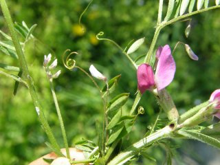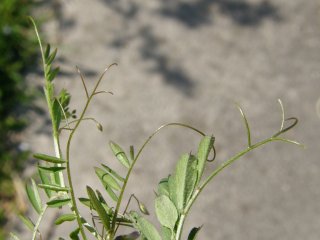 【右】葉の先のヒゲ。左からスズメノエンドウ、カスマグサ、カラスノエンドウ