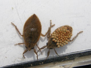 【左】コオイムシの雄と雌、卵を背負っているのが雄です。