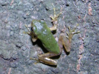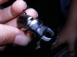 午後7:00過ぎ、降幡会長の先導で旭公園を横切ってコナラ、アラカシ、スダジイなどの林の中を虫を探しながら大同グランドに向かいました。穴だらけのアラカシの幹には根元から50cmくらいのところに大きなムカデがトグロを巻き(?)、2mぐらいの高さにはカナブンが集まっていました。ちびっ子たちは頭上のカナブンを捕らえようと手網を伸ばして木の周りをぐるぐる回ります。会員は、はらはらして「ムカデ」「ムカデ」と叫び続けました。公園の東の道路を横切って大同グランドに移動してバックネットに設置された灯火装置(白布を広げて電灯を照射し、虫を集める装置・・・・電源のないところでは発電機を用意しなくてはならないので大変です)をちょっとのぞいて(虫はまだあまり集まっていないので、最後はここに戻ることを知らせるために)グランドを横切り、東の林の中へ入りました。林内は暗く、足元は傾斜があって滑りやすく、段差や倒木もあってちびっ子たちにはちょっとした冒険気分になったものと思われます。林を抜けたところの繁みにクロマドボタルが光っているのを発見し、全員が交代して観察していると、水田のほうから「ホタルが飛んだぞー」の声が聞こえてきたので水田のほうに移動しました。もうヘイケボタルの最盛期は過ぎているのでほんのわずかでしたが茂みや水田の稲で光っているホタルを見ることができました。帰りは広い道路に出て虫を探しながらグランドに戻りました。