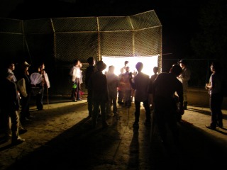 午後7:00前、旭公園北駐車場には手網や虫かごに加えて懐中電灯をもった人達が大勢集まっていました。本日の主担当の平松さんがしきりに空を見ながら思案のすえ、灯火装置を設置するため大同グランドに走りました。