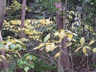 【左】傾いた木から見る紅葉 【右】イヌビワの黄葉