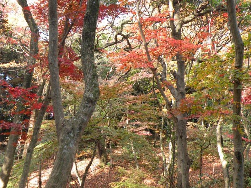 モミジ谷には何人か紅葉を見に来てる人がいた。去年の台風で何本も倒れたが、今は何もなかったかのように見えてしまう。いろんなモミジの葉を拾いながら、今年も太いモッコクの木に目が行った。残っていてくれてありがとうという、まさにその気持ちである。また、モチノキの花芽もこんなときでないと、ゆっくり見られないのでみんなで見る。(記・中井康 )