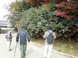 オオスズメ蜂の巣もあり、寒くなり元気の無いスズメバチと巣も観賞できた。鵜の糞から愛知用水の環境を守る為にガロン缶が所々に設置されていた。鵜が営巣しない用に夕方にパトロールしてガロン缶を叩き鵜を追い掃うそうだ。効果はあり今のところ以前のような鵜の糞で白い枝の林は無くなっている。帰路大橋北東の林に立ち入り、入り江に浮かび、休息中のカモの仲間を観賞し、山茶花の咲き乱れる園路を梅の館へと戻り分かち合いをして解散する。 【観察できた生物】