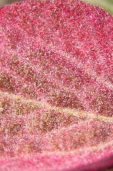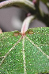 【中】アカメガシワの葉には星型の赤い毛がたくさん生えてきれいです。右は葉の付け根に蜜泉で、舐めると少し甘くアリさんが集まります。