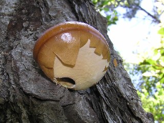 【右】枯れたマツに付くヒトクチタケで、下の穴から胞子を出します。一口ですが食用にはなりません。