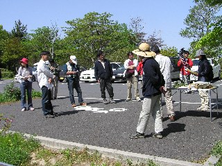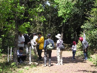 【右】任坊山の四等三角点見学。ちなみに一等18cm角、二等と三等は15cm角、四等は12cm角の御影石(花崗岩)だそうです。