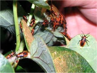 【左】ヒメジュウジナガカメムシの幼虫…葉裏に群がっていました(駐車場にて)