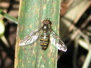 【中】ホソヒラタアブ(林内の池のふちの日当たりにいました。成虫越冬し、晴れた日には花の周りを飛び回っています)