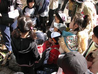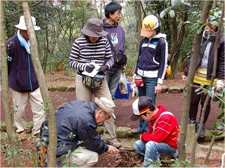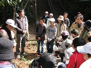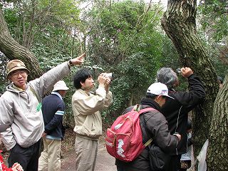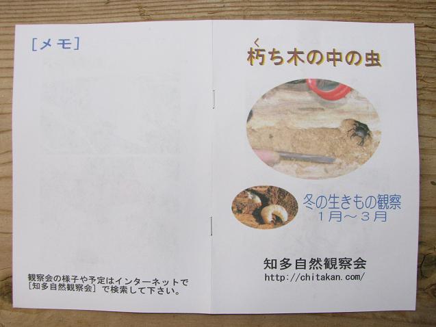 当日の午前2時頃はじゃじゃ降りの雨だったのに起きてみれば快晴。会場で「この中に誰か晴れ女か晴れ男がいる」と言い合っていました。防寒具はとても着ておれない春みたいな天気でした。 半田市環境センター担当の挨拶の後、先ずは、駐車場で朽ち木の中の虫の探し方を練習し、そのあと、公園内の現場で実施しました。当然のことかも知れませんが、公園内は掃除が行き届きすぎ(?)ていて、クワガタなどの虫が入っているような朽ち木はそんなに多くありません。それでも一部の場所にそれなりの朽ち木があって、参加者は虫探しに頑張りました。 結果は、いつも思うことなのですが、誰かが何かを見つけて全体では結構多くの種類を見ることができました。