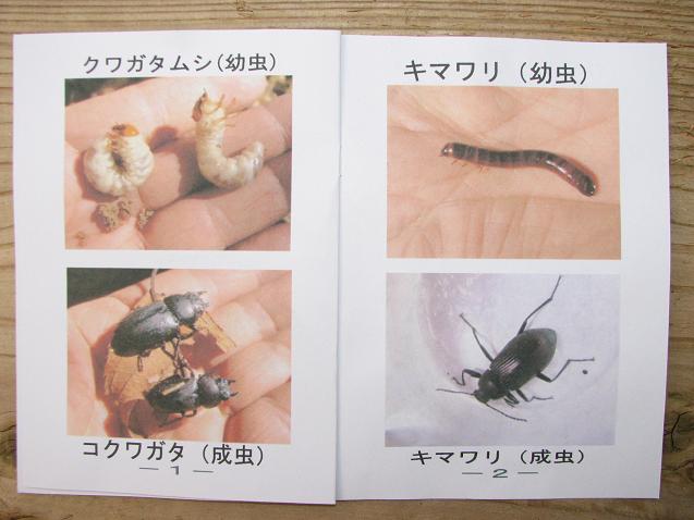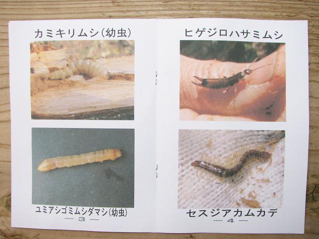 クワガタの幼虫と成虫、キマワリの幼虫、ユミアシゴミムシダマシの幼虫と成虫、カミキリムシの幼虫、ヒゲジロハサミムシ、ウバタマコメツキ、マクラギヤスデ、コガタスズメバチ、ムカデ2〜3種類、蟻2〜3種類