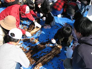 【左】虫のたくさん入っている練習用の木で練習 【右】公園内で適切な朽ち木を見つけて挑戦