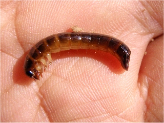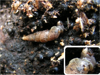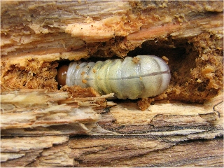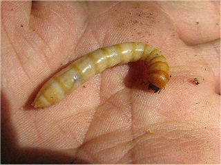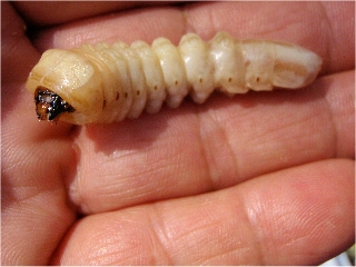 【左&中】クワガタムシの幼虫 と コクワガタ(メス) 【右】カミキリムシ(ウスバカミキリ?)の幼虫
