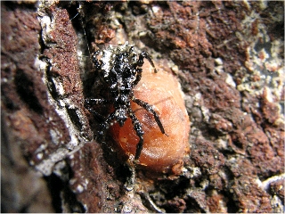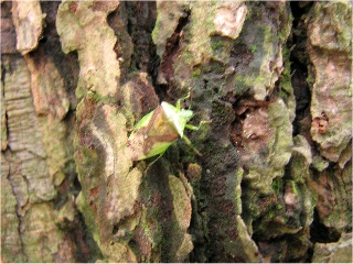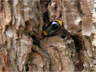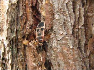 【左】この松の幹にたくさんいました 【中】ウバタマコメツキが好きなところ 【右】ここにもカメムシが一匹