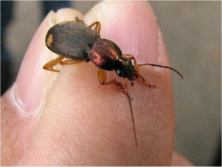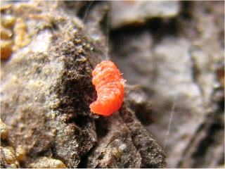 【左】ツヤアオカメムシ? 【中】キボシアオゴミムシ? 【右】全長1mmほどの赤い幼虫…オームの幼虫