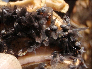 【左】イスノキの虫コブ 【中】虫コブを割って中を見る 【右】左の拡大…ハエみたいな虫がいっぱい