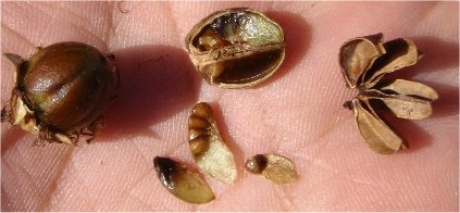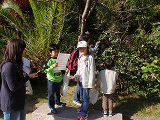 を配付。掲載写真はこの公園で撮影した木の実。掲載の“サルスベリの実”(最下段の写真参照) は指導員も見たことがない人が多くいたので、まず、そこから観察を始めました。発見した木の実の前で、リーフレットで確認しながらの観察でした。今回のコースではリーフレットに掲載種の半分ぐらいの種類を見ました。