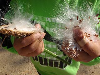 【左】ウラギンシジミ(成虫で越冬する) 【中】お土産のハエタタキを持って 【右】ガガイモの種子で大遊びする