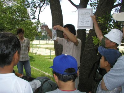 台風が近づいて雲の動きが激しく、ぎらぎら太陽が輝いたかと思うと今にもふりそうな暗い雲になったり落ち着かない天気だった。が、水に入ってしまえばそんなことはどこへやら、大人も子供も目を輝かせて たもを振り回していた。親子連れ(お父さんも一緒)の参加者が多かった。はじめはおっかなびっくりだった子供たちも、親のたもの使い方を見よう見真似で習得して、草陰を足で踏むなどめきめき「たも名人」になっていった。だれか、河童になりきって泳いでいる子もいて、周りから「いいねえ。でも水だけは飲むな!」と声がかかっていた。エコマップの関係者の方も参加されていた。ネイチュア・フィーリングではないが、車椅子の方でデジカメを足を使って撮影しておられるのを見て、そういう参加の仕方もあるのだなと少しびっくりした。
