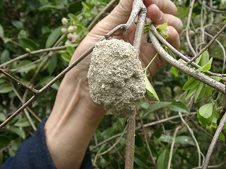 【左】枝についた土のかたまりは狩人蜂のスズバチの巣です。鈴の形から名前が付いたみたいです。