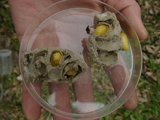 【右】土の中の様子。ハチのさなぎが6匹入っていました。ハチの種類…現在調査中