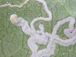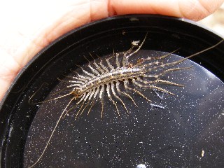 【左】ハモグリバエ、別名ジカキムシ(字書き虫)。カクレミノですのでヨメナスジハモグリバエでしょうか。 【右】ゲジ。ゲジゲジと嫌いますが人間に害を与えず、害虫を取ってくれる益虫です。