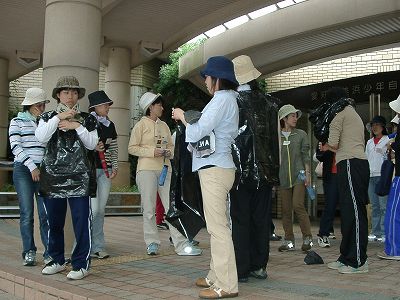 【左】雨が強く降っていたので、ゴミ袋をカッパに仕立てている参加者もいました。
