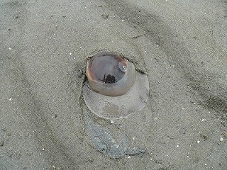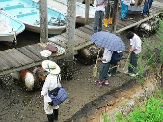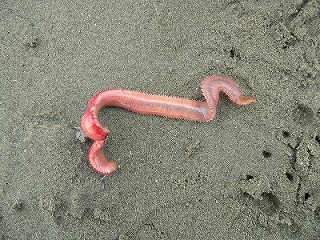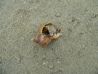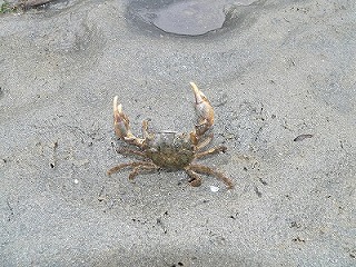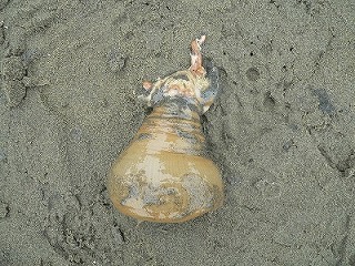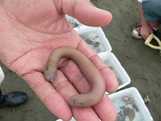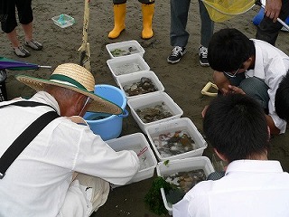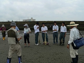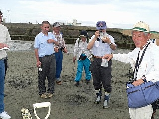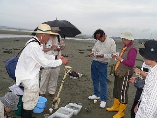 あいにくの雨で、参加者は名古屋環境大学の方のみとなった。講師の森田博文さんの 作成した「ようこそ山王川河口干潟へ」という観察のしおりを基に、蟹と貝の説明があ り、山王川河口干潟へ入り、チゴガニ、ウミニナ、ヘナタリ、コメツキガニの観察をし た。次に、奥田海岸砂浜干潟へ、場所を移し、初めに危険な生き物(ゴンズイ、アイゴ、 アカエイ、アカクラゲ、ハオコゼ、イシガニ)の扱いについての説明があったので、皆、 安心して採集することができた。昔、このあたりは、アマモ林であったが、海苔の養殖 のため、今ではアマモを刈り取ってしまった。木曽川と山王川の砂が波打つと、海苔の 作業が危険なので、ブルトーザーで砂を平にする作業をしていた。(記:吉房)