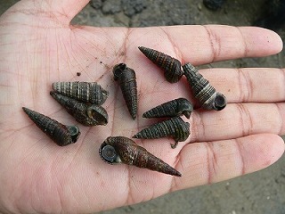 【左】山王川河口での観察 【右】採集したウミニナ類(ウミニナ、ホソウミニナ、フトヘナタリ、ヘナタリ)の一部