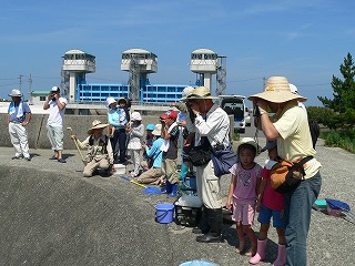 山王川河口干潟へ移動して観察会を始めたが、子供1名が暑さで気分を悪くしたため1家族3名は早々に帰宅した。