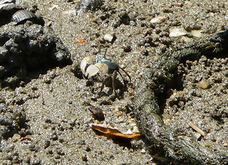 【左】ウエービングするチゴガニ 【中】ウミニナ類(ウミニナ、ホソウミニナ、フトヘナタリ、ヘナタリ)の群生 【右】木陰で河口干潟の生き物解説