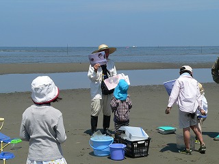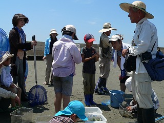 家族単位で波打ち際や突堤周辺に散ってカニ類、エビ類、魚類の観察や採集が始まり、個別にスタッフが質問に応じた。